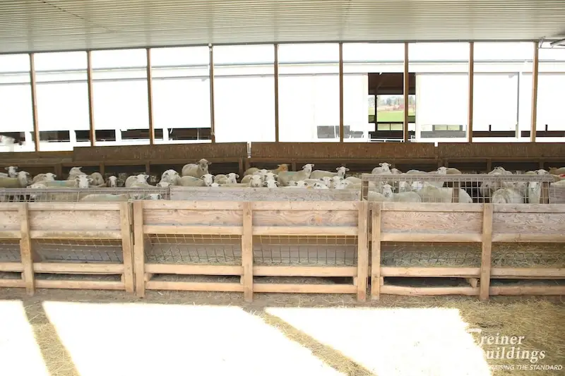 This 60′ x 208′ livestock facility was built for Stan and Jean’s sheep operation. Half of the building is lined and insulated to house lambing ewes. The other half of the building is separated with overhead doors into open air pens.