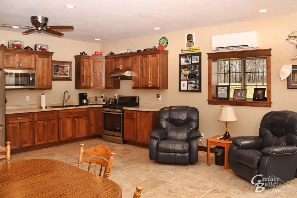 Greiner Buildings, Inc built the Lined and Insulated Shop, while Matt, the owner, finished off his Man Cave with help from friends. Color matching doors, cupulas, and wainscoting add to the beauty of this farm shop. Not only is it a comfortable environment to work, but also to enjoy with friends and family.