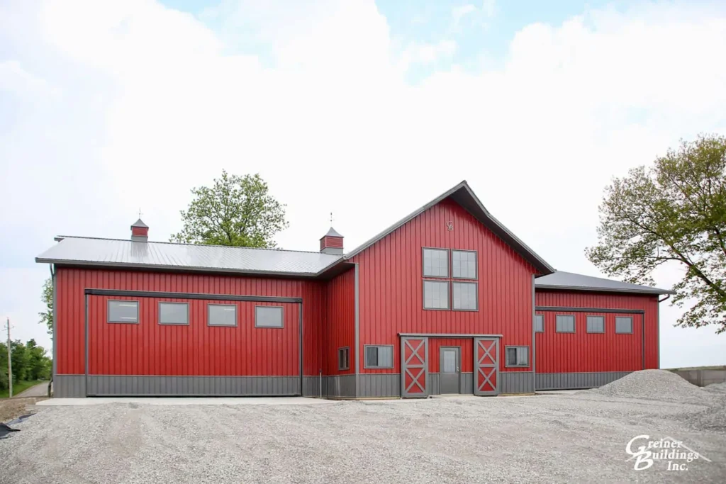 The post frame building industry has come a long way from a rectangle box with a slider door. Windows add beautiful curb appeal to the post frame buildings we construct. Our Greiner Buildings team likes to fully understand your purpose for the building, what will your pole barn be used for? We often hear, “I don’t want it to look like a pole barn.” Greiner Buildings would like to offer some post frame window ideas to help you achieve your dream building. We also have the custom ability to add different roof pitches, porches, cupulas, and so much more to your post frame garage, machine shed, lined and insulated shop, residential home or commercial building.