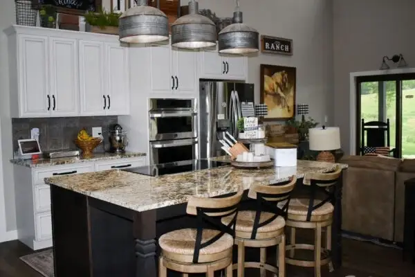 This 30’x56’x17′ SHOME® with 30’x32’x10′ shop located in the beautiful countryside of IL sure brings those countryside vibes with a large 8′ wide wrap around porch overlooking the horse pasture. The white galvanized metal shows its elegance and pops with black windows and beautiful farmhouse style light fixtures. Walk into the large living space with a cozy fireplace, 17′ ft pine ship lap ceilings, and adjoining large kitchen space. Flying gables, color combinations, L-shape orientation, and the porch give it architectural beauty!