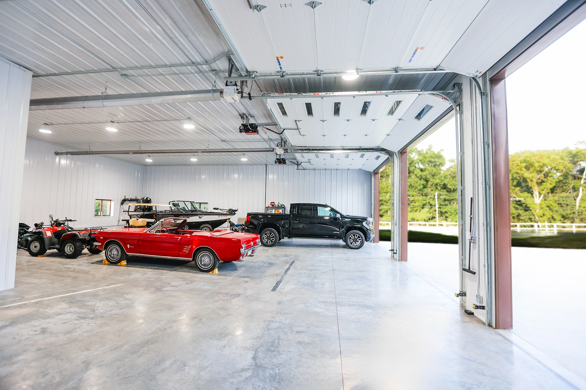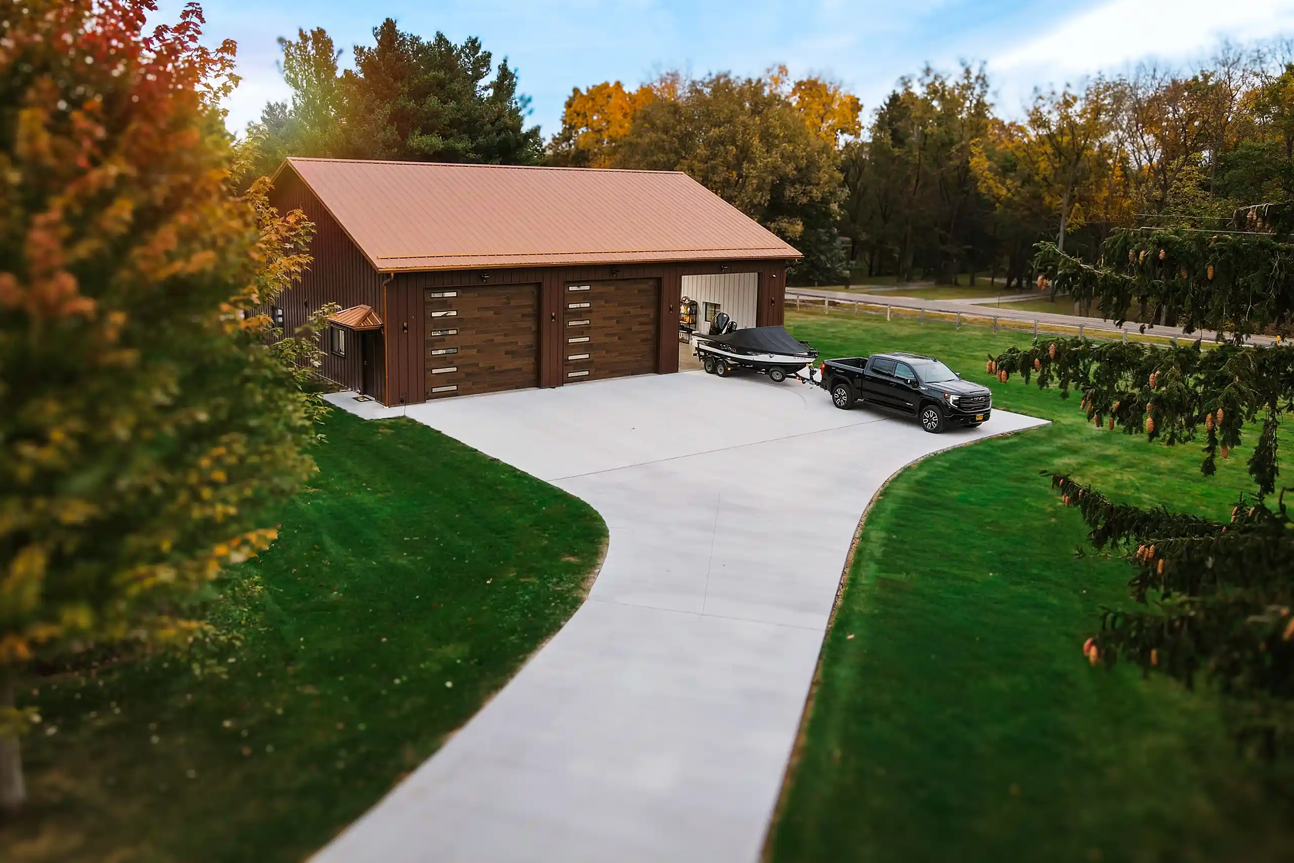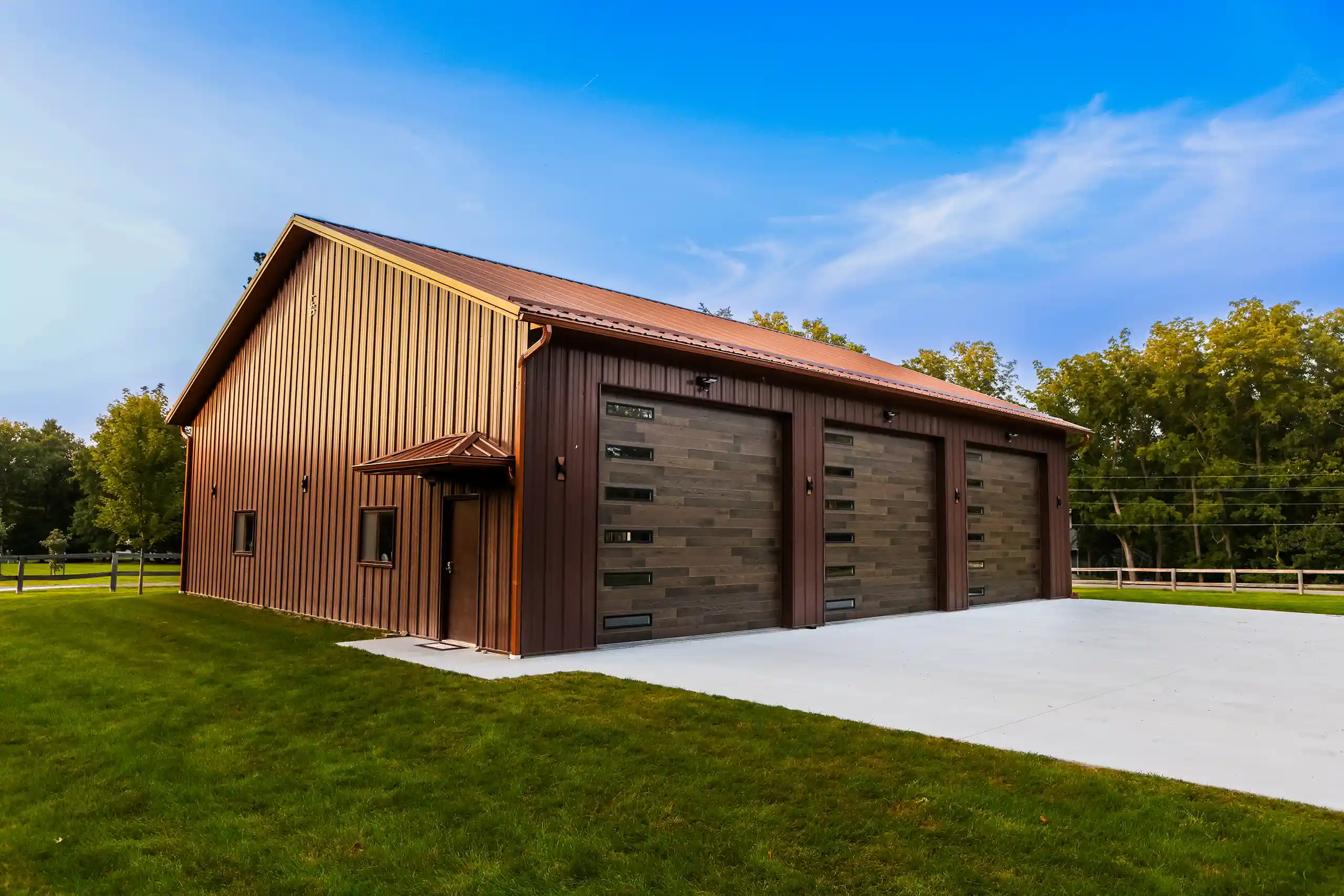 This 48’ x 56’ x 14’ lined and insulated shop garage pairs Chestnut steel siding with a striking Penny metal roof for a look that’s both classic and distinctive. Built by Greiner Buildings, this custom post-frame building offers a fully finished, temperature-controlled interior—perfect for boat storage, working on a classic Mustang, or entertaining friends and family year-round. An additional storage room provides practical space for tools and seasonal gear, while the clean, open layout makes this residential shop both beautiful and functional. Penny Lane combines craftsmanship, comfort, and versatility in one durable custom metal building designed to last for generations