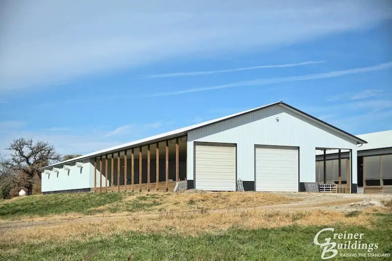 Unique features: The lined and insulated portion has an office/wash area, in-ground waterers, large vent fans for proper air circulation, and large doors for equipment to easily move into the building. Galebreaker was installed in the open post end for wind and heat protection while offering plenty of airflow.