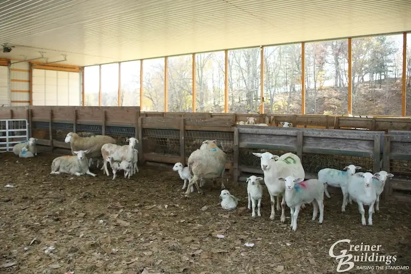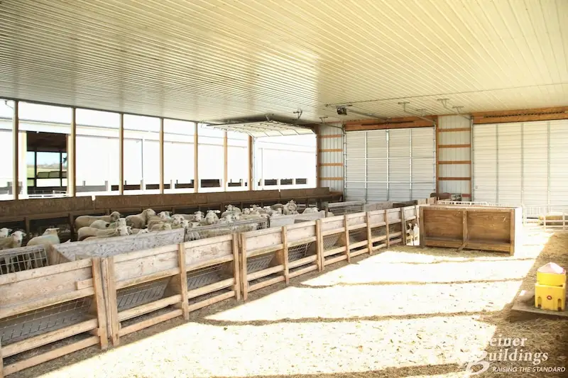 This 60′ x 208′ livestock facility was built for Stan and Jean’s sheep operation. Half of the building is lined and insulated to house lambing ewes. The other half of the building is separated with overhead doors into open air pens.