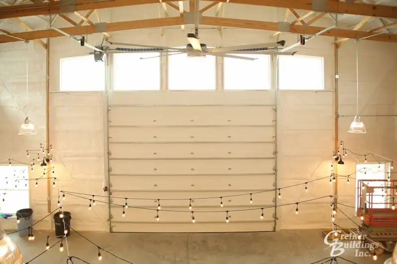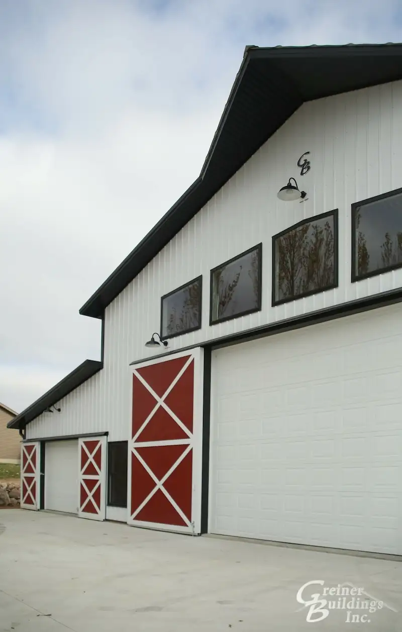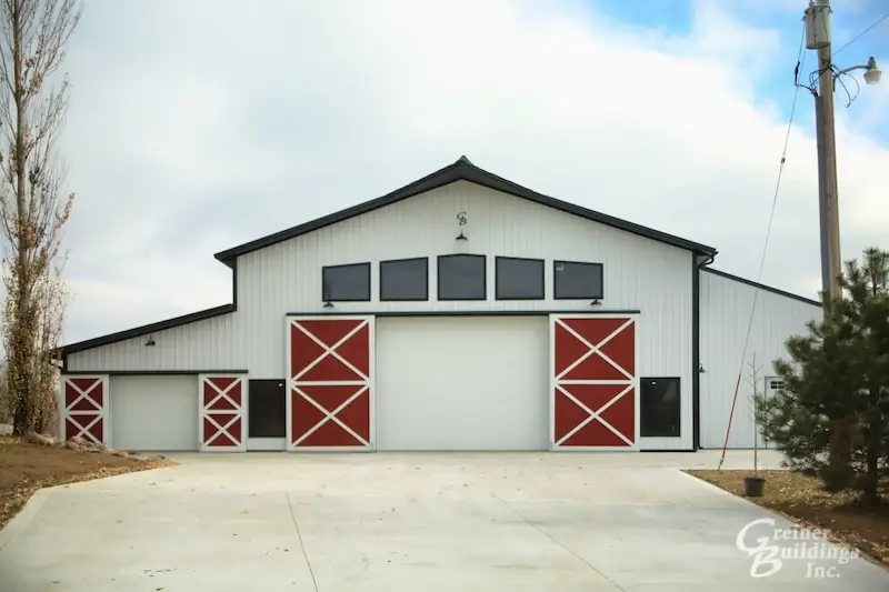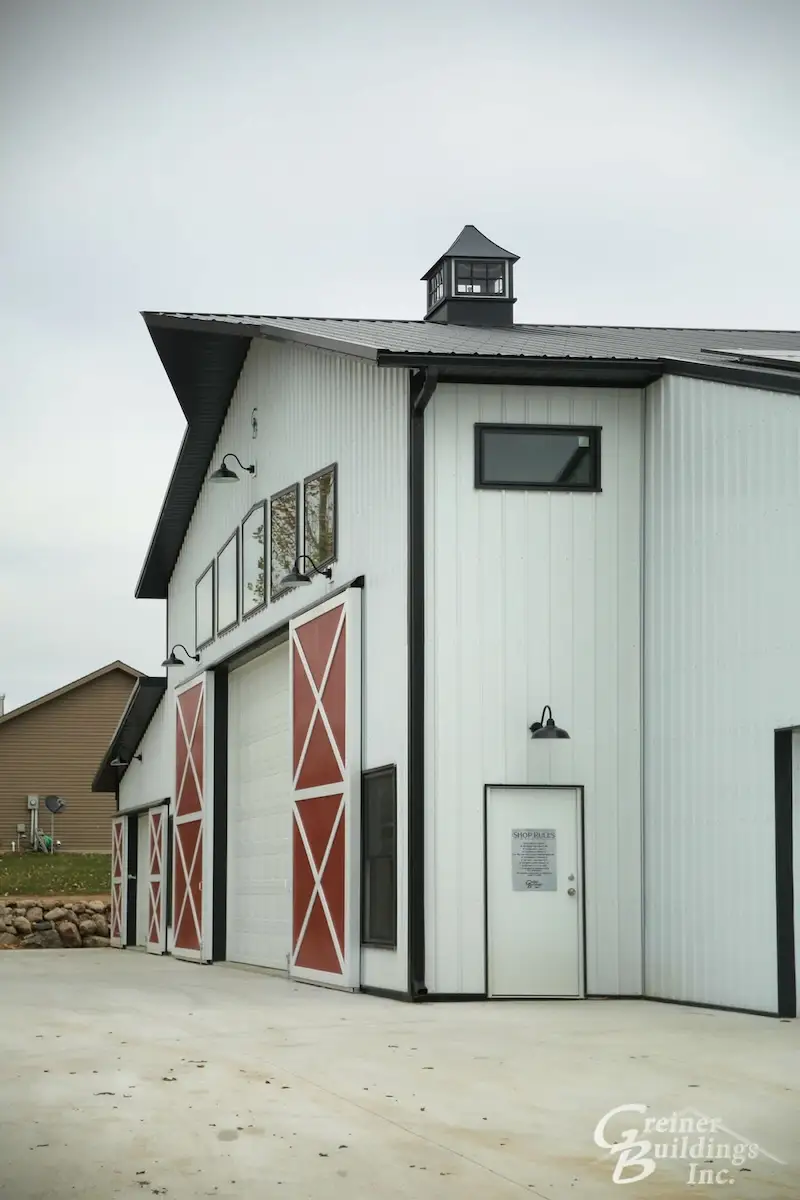 The owners were looking to update their existing 30′ x 45′ x 10′ post frame building with a large 20′ x 15′ Arcadian door. It was a beautiful addition for added curb appeal. Greiner Buildings crews did an excellent job working the existing roofline into the new building.