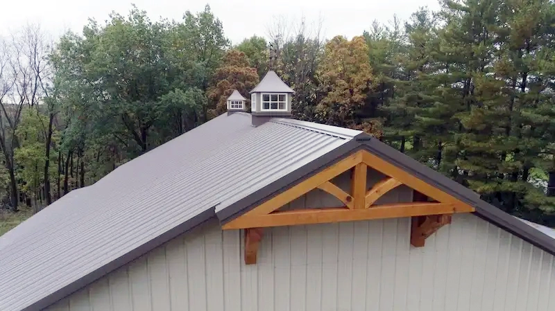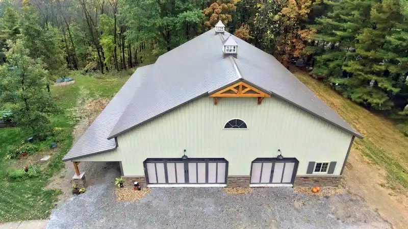 Post-frame advantage: The large clear span allows the owners ample parking space and working area on their lot. They appreciated the custom look and add-ons Greiner Buildings provided their new garage.