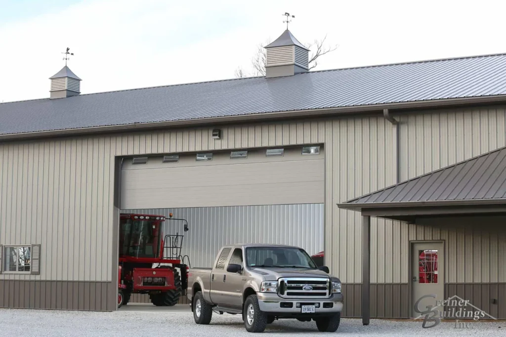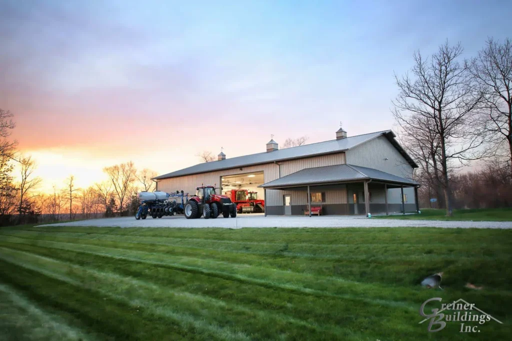 Lined and Insulated Post Frame Pole Barn Machine Shed with porch and overhead doors built by Greiner Buildings.