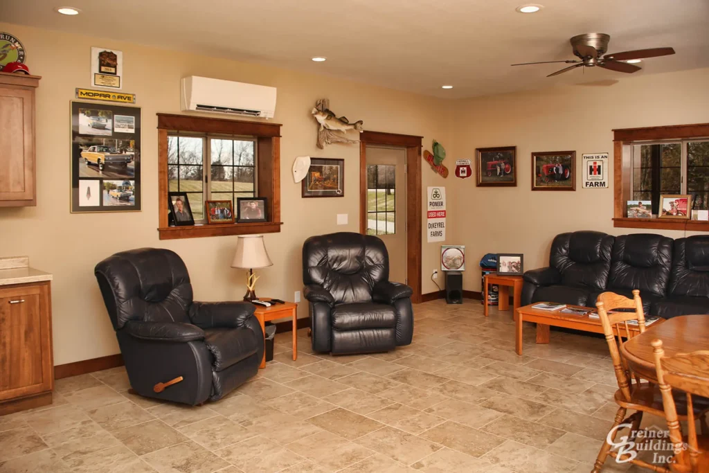 Greiner Buildings, Inc built the Lined and Insulated Shop, while Matt, the owner, finished off his Man Cave with help from friends. Color matching doors, cupulas, and wainscoting add to the beauty of this farm shop. Not only is it a comfortable environment to work, but also to enjoy with friends and family.