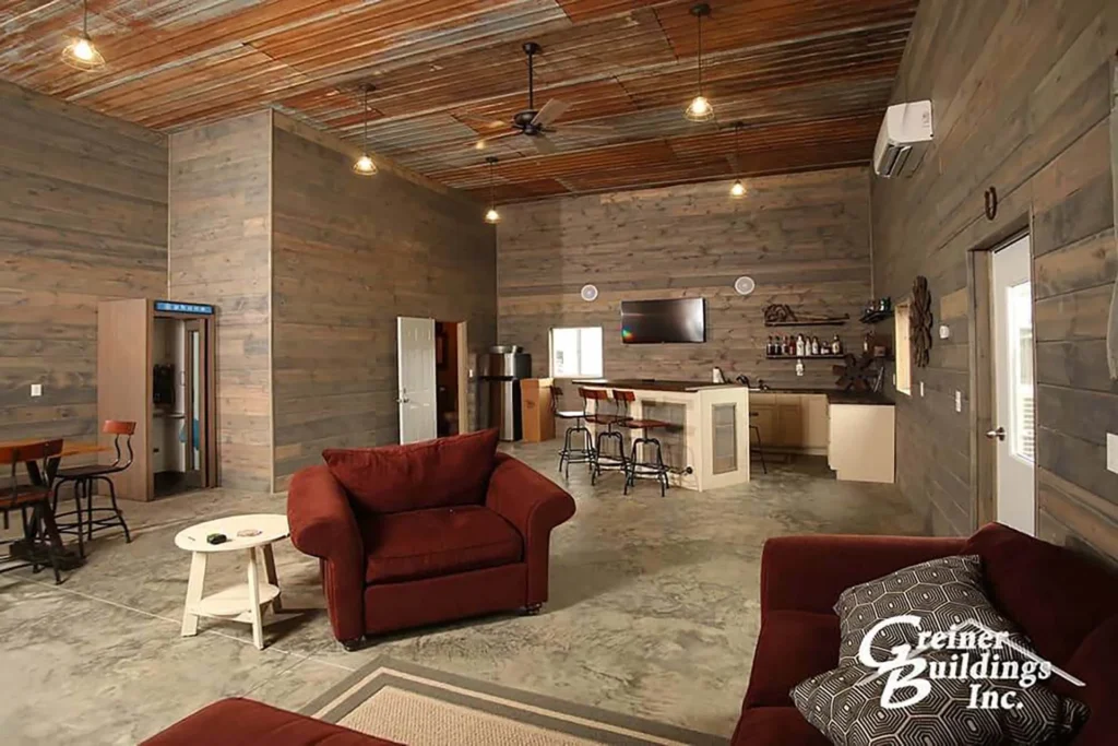 Nothing wrong with just using folding chairs and tables inside your pole barn or man cave – but if you’re one for the occasional afternoon nap, don’t hesitate to put a nice couch or recliner in there. Adding a ceiling fan or two is another easy way to keep your metal structure comfortable year-round.