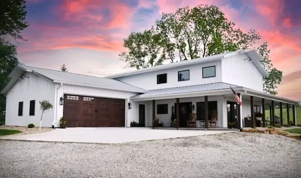 This 30’x56’x17′ SHOME® with 30’x32’x10′ shop located in the beautiful countryside of IL sure brings those countryside vibes with a large 8′ wide wrap around porch overlooking the horse pasture. The white galvanized metal shows its elegance and pops with black windows and beautiful farmhouse style light fixtures. Walk into the large living space with a cozy fireplace, 17′ ft pine ship lap ceilings, and adjoining large kitchen space. Flying gables, color combinations, L-shape orientation, and the porch give it architectural beauty!