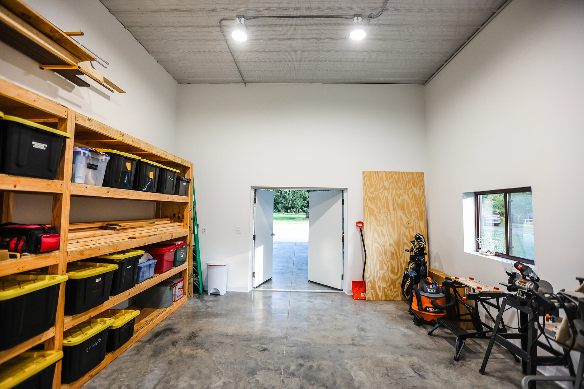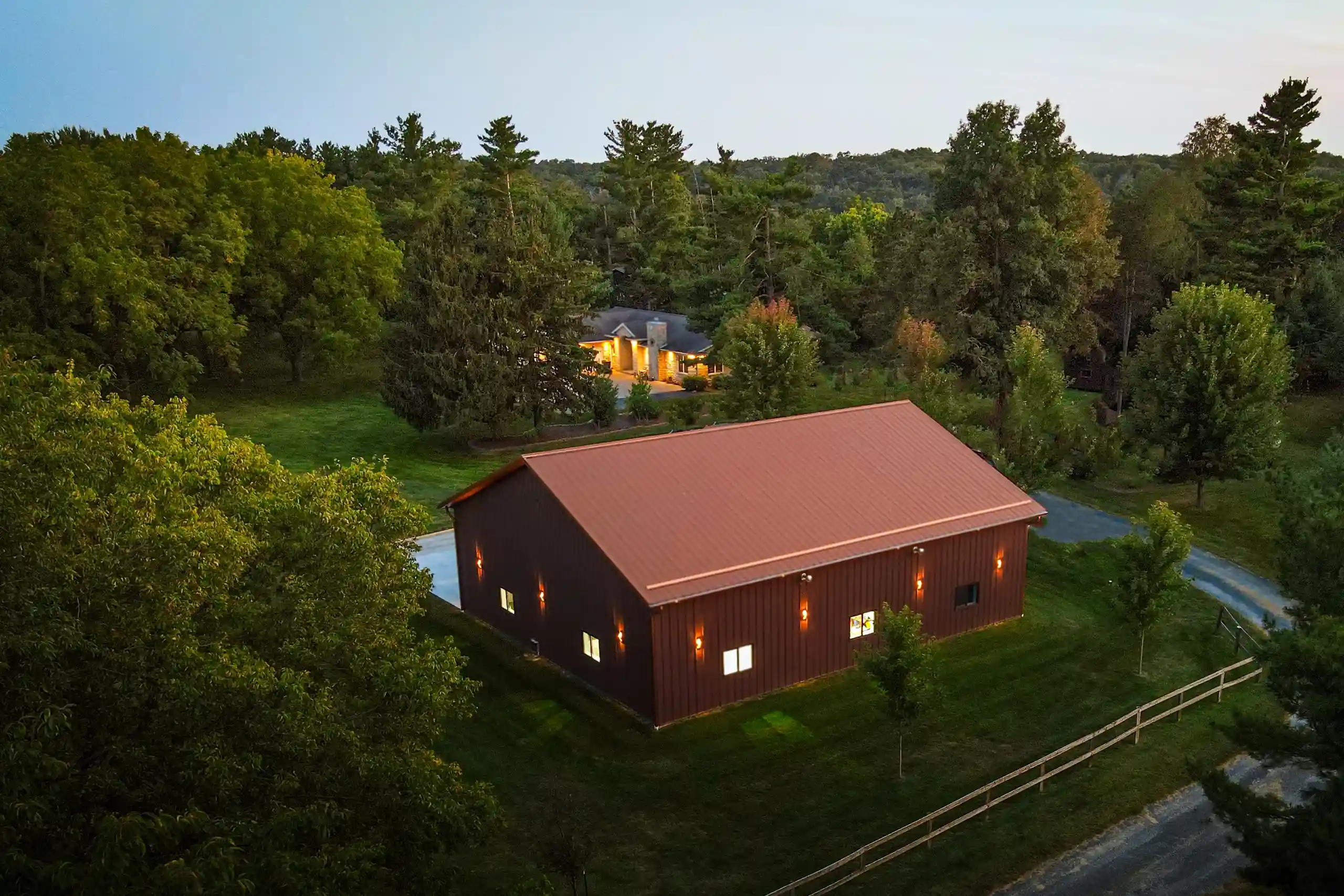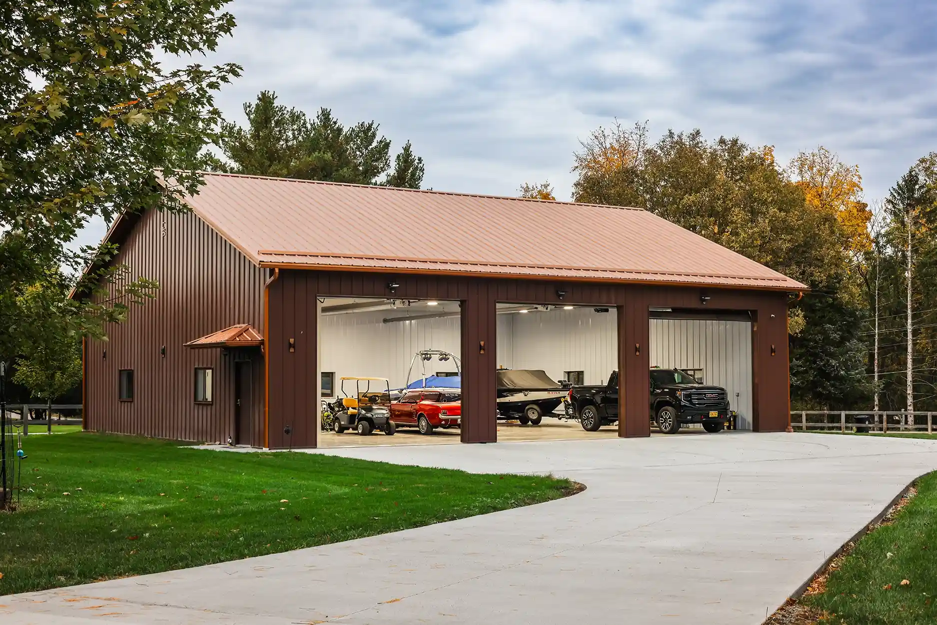 This 48’ x 56’ x 14’ lined and insulated shop garage pairs Chestnut steel siding with a striking Penny metal roof for a look that’s both classic and distinctive. Built by Greiner Buildings, this custom post-frame building offers a fully finished, temperature-controlled interior—perfect for boat storage, working on a classic Mustang, or entertaining friends and family year-round. An additional storage room provides practical space for tools and seasonal gear, while the clean, open layout makes this residential shop both beautiful and functional. Penny Lane combines craftsmanship, comfort, and versatility in one durable custom metal building designed to last for generations