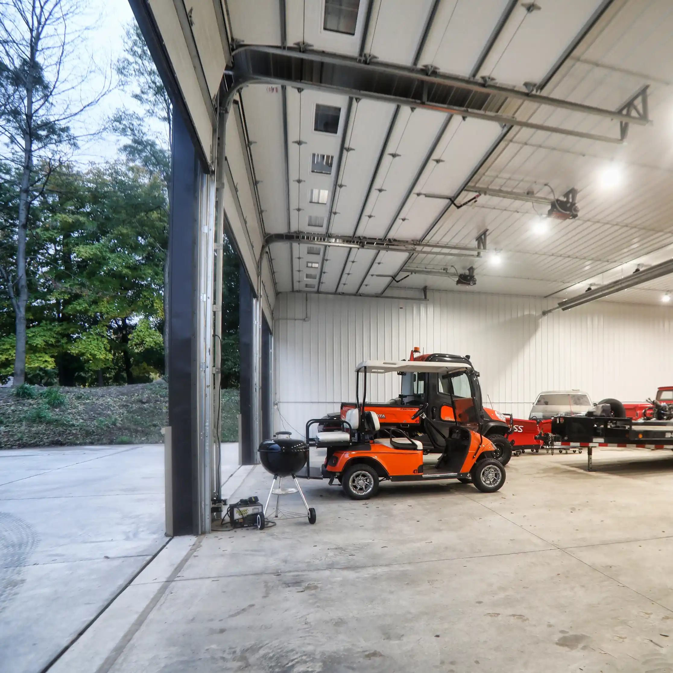 This 60’ x 60’ x 16’ garage and hobby shop makes a statement with its rich CS Kynar Bronze steel exterior, accented by Versetta Stone wainscoting in Plum Creek for a bold, custom look. Inside, the lined and insulated design provides year-round temperature control, making it ideal for working on and showcasing collectible cars. Multiple access points and an expansive, open interior create flexibility for mechanical work, serious storage, or simply relaxing with friends while grilling and talking shop. A high-performance garage built to deliver beauty, function, and lasting value.
